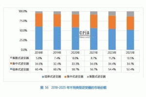 光伏逆變器按照適用場所分為集中式逆變器、集散式逆變器、組串式逆變器以及微型逆變器。2018 年,光伏逆變器市場仍然主要以集中式逆變器和組串式逆變器為主,微型和集散式逆變器占比較小。隨著分布式光伏市場的快速增大及集中式光伏電站中組串式逆變器占比的增高,組串式逆變器在 2018 年的市場占比達到了 60.4%。集散式光伏逆變器相比集中式逆變器提升 MPPT 控制效果,且相比組串式逆變解決方案擁有較低的建造成本。因此,市場份額呈現(xiàn)出逐年上升的趨勢。2018-2025 年不同類型逆變器的市場份額如下圖所示。