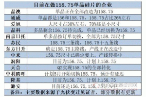 大尺寸:所謂大尺寸即硅片尺寸由常規(guī)的156.75毫米調(diào)整為158.75毫米。隨著光伏平價(jià)與競價(jià)時(shí)代的到來,整個(gè)產(chǎn)業(yè)鏈都在尋求降本增效的途徑,任何環(huán)節(jié)的微創(chuàng)新都有可能降低度電成本,加速平價(jià)光伏項(xiàng)目的崛起。以硅片的尺寸調(diào)增為例,其最大的優(yōu)勢是在制造成本不增加、組件面積不明顯改變的前提下提高了組件功率,從而使得單瓦成本更低。單位時(shí)間內(nèi)生產(chǎn)成本的不變,大尺寸硅片意味著更高的產(chǎn)出。就目前而言,行業(yè)內(nèi)的上游企業(yè)正在進(jìn)行對158.75硅片的產(chǎn)線改造,具體如下表所示: