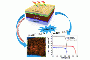 該團(tuán)隊(duì)使用真空熱蒸發(fā)沉積薄膜的方法,以三氧化鉬/金納米網(wǎng)/三氧化鉬“三明治結(jié)構(gòu)”作為透明電極,替換掉傳統(tǒng)鈣鈦礦電池中的金屬背電極。制備的半透明鈣鈦礦太陽能電池具有18.3%的光電轉(zhuǎn)化效率,這是目前使用超薄金屬制備的半透明鈣鈦礦電池的最高效率之一。將此半透明鈣鈦礦太陽能電池與光電轉(zhuǎn)化效率23.3%的硅異質(zhì)結(jié)薄膜電池結(jié)合,得到了光電轉(zhuǎn)換效率27.0%的四端疊層太陽能電池。
