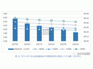 2019年,全國光伏的年均利用小時(shí)數(shù)為1169小時(shí),光伏電站建設(shè)成本4.5元/W,此時(shí)度電成本為0.44元/度。
