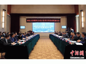 千噸級液態(tài)太陽燃料合成(又稱“液態(tài)陽光”)示范項目科技成果鑒定會會場。(中科院大連化物所 供圖)記者從中國科學院大連化學物理研究所(中科院大連化物所)獲悉,由該所研發(fā)的千噸級液態(tài)太陽燃料合成(又稱“液態(tài)陽光”)示范項目,15日在甘肅蘭州通過中國石油和化學工業(yè)聯(lián)合會組織的科技成果鑒定。鑒定委員會專家一致認為