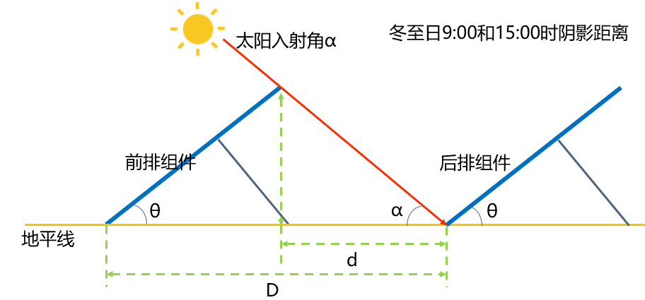 在使用最佳傾角計(jì)算好前后排間距后適當(dāng)減少組件安裝角度3~5°,可以有效地提高冬季光照時(shí)長。如圖所示: