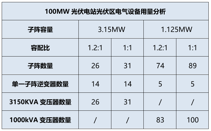 采用大子陣、高容配比的設(shè)計(jì)方案,減少整個(gè)項(xiàng)目的子陣數(shù)量可以有效的節(jié)約光伏區(qū)箱變的使用量及安裝量,從而降低系統(tǒng)建設(shè)成本。例如一個(gè)100MW電站進(jìn)行不同容量子陣和容配比的比較,如下表: