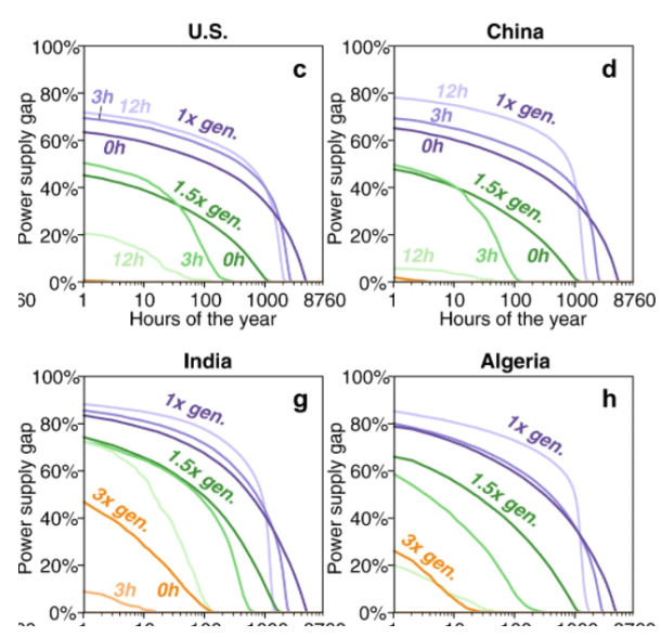 事實(shí)上,當(dāng)查看上圖右下方的方框時(shí),該方框具有12小時(shí)的電池儲能系統(tǒng)和1.5倍的標(biāo)準(zhǔn)發(fā)電量,風(fēng)力發(fā)電和太陽能發(fā)電滿足電力需求的能力使研究中分析的所有國家和國都超過了97%;有幾個(gè)國家可以滿足100%的需求!