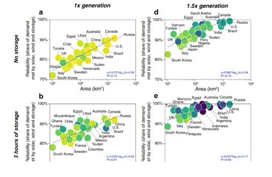 研究發(fā)現(xiàn),土地面積較大的國家和地區(qū)可以構(gòu)建可靠性更高的風(fēng)力+太陽能,電網(wǎng)。對于沒有部署儲能系統(tǒng)的電網(wǎng),土地面積每增加10倍,滿足能源需求的能力就會提高7.2%!