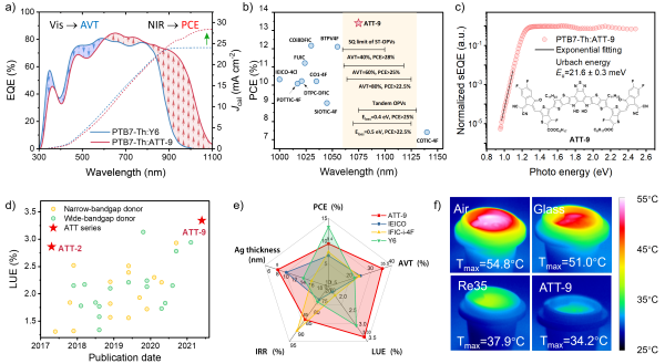 最近,團(tuán)隊(duì)開(kāi)展了半透明光伏的理論研究。從精細(xì)平衡理論出發(fā),通過(guò)建立理想的“給受體近紅外區(qū)互補(bǔ)吸收”的EQE模型,得出如下結(jié)論:1、半透明光伏器件的光利用效率(LUE,LUE=PCE×AVT)由給受體共同決定,這印證了“給受體材料近紅外區(qū)互補(bǔ)吸收”策略的科學(xué)性;2、半透明的有機(jī)光伏最優(yōu)帶隙遠(yuǎn)遠(yuǎn)小于常規(guī)不透明光伏最優(yōu)帶隙;3、材料設(shè)計(jì)對(duì)于提升半透明器件的性能至關(guān)重要。基于此,研究團(tuán)隊(duì)通過(guò)醌式共振效應(yīng)設(shè)計(jì)了一個(gè)超窄帶隙非富勒烯受體,基于其與窄帶隙電子給體匹配的光伏器件的光譜響應(yīng)達(dá)到1075 nm (1.15 eV),接近了半透明光伏的最優(yōu)帶隙。受益于拓展的近紅外吸收,不透明器件獲得了有機(jī)光伏中首次超過(guò)30 mA cm-2的短路電流密度和超過(guò)1000 nm非富勒烯光伏中最高的光電轉(zhuǎn)換效率(13.32%)。通過(guò)器件優(yōu)化,半透明器件在35%的平均可見(jiàn)光透過(guò)率下取得了9.37%的光電轉(zhuǎn)換效率,實(shí)現(xiàn)了3.33%的LUE,是基于非光學(xué)修飾半透明器件中的最高值,有利于實(shí)現(xiàn)低成本加工和有機(jī)半導(dǎo)體的本征柔性特性。此外強(qiáng)近紅外吸收的半透明器件還具有良好的隔熱效率(IRR),在發(fā)電的同時(shí),獲得了超過(guò)相同透過(guò)率商用3M隔熱窗膜的隔熱性能。相關(guān)成果發(fā)表在Adv. Mater.上。