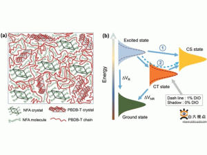 (a)非富勒烯有機太陽能電池共混膜中形貌與(b)光物理路徑圖 山東大學(xué)供圖