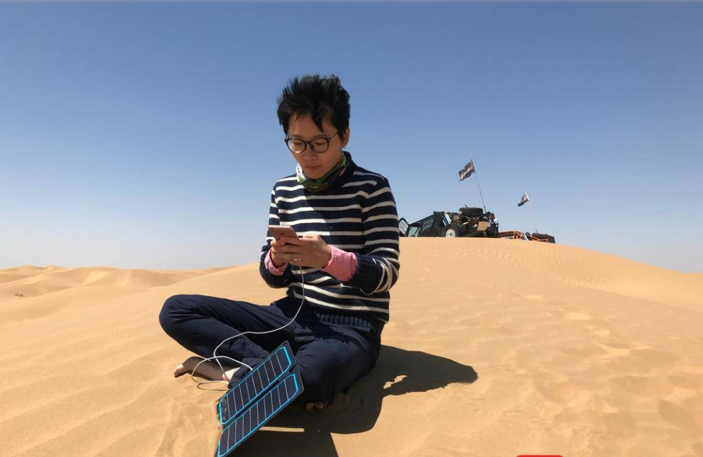 凝聚態(tài)物理學博士李懿是一名85后創(chuàng)業(yè)者。閑暇之余,李懿便奔向戶外,與森林、草地、山川、星空為伴。身處沙漠的李懿,使用便攜式太陽能板為手機充電
