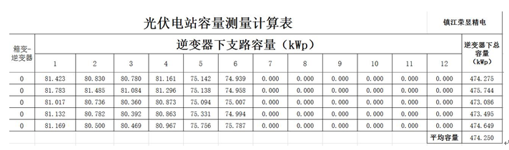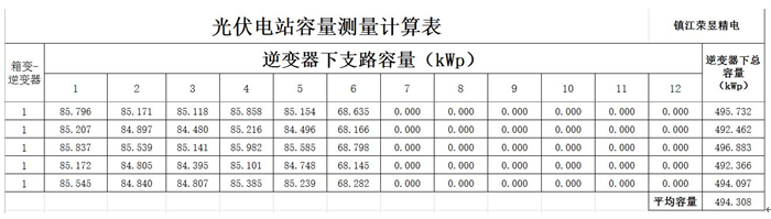 從測(cè)量計(jì)算表中可以看到,對(duì)其中一臺(tái)逆變器下容量測(cè)量5次,其測(cè)量值分別為495.732kWp、492.462 kWp、496.883 kWp、492.366 kWp、494.097kWp,平均容量為494.308kWp,實(shí)際容量短缺0.67%,考慮約1%的測(cè)量誤差,所以該逆變器下實(shí)際容量沒(méi)有短缺。