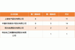 日前,國電投第一批和第二批領(lǐng)跑者共1.3GW招標結(jié)果公布,其中光伏逆變器招標分別分為11個標段與19個標段,其中中建材中標14個標段,上能電氣包攬集散式9個標段和集中式2個標段,中標容量460MW,陽光電源與特變分別中標4個和1個,各家斬獲頗豐。