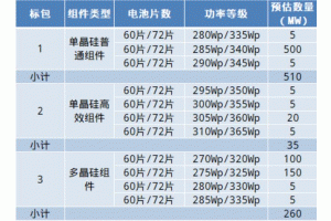 2.范圍:本招標(biāo)項目劃分為5個標(biāo)段,本次招標(biāo)為其中的:(001)單晶硅普通組件;(002)單晶硅高效組件;(003)多晶硅組件;(004)單晶硅雙玻組件;(005)多晶硅雙玻組件。潛在投標(biāo)人可以對某一標(biāo)段或全部標(biāo)段進(jìn)行投標(biāo),兼投兼中。
