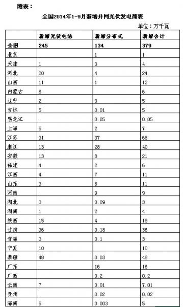 2014年前三季度,全國(guó)新增光伏發(fā)電并網(wǎng)容量379萬千瓦,其中,新增光伏電站并網(wǎng)容量245萬千瓦,新增分布式光伏并網(wǎng)容量134萬千瓦;全國(guó)光伏發(fā)電量約180億千瓦時(shí),相當(dāng)于2013年全年發(fā)電量的200%。國(guó)家電網(wǎng)公司經(jīng)營(yíng)范圍內(nèi)新增光伏發(fā)電裝機(jī)320萬千瓦,其中光伏電站205萬千瓦,分布式115萬千瓦;南方電網(wǎng)公司經(jīng)營(yíng)范圍內(nèi)新增光伏發(fā)電裝機(jī)28萬千瓦,其中光伏電站12萬千瓦,分布式16萬千瓦。甘肅、青海和新疆累計(jì)光伏電站并網(wǎng)容量最多,分別達(dá)到466萬千瓦、365萬千瓦和313萬千瓦。江蘇、浙江和廣東累計(jì)分布式并網(wǎng)容量最多,分別達(dá)到70萬千瓦、46萬千瓦和44萬千瓦。