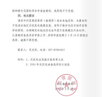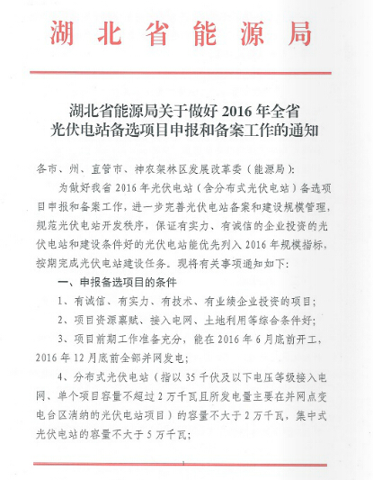 湖北省能源局關(guān)于做好2016年全省光伏電站備選項(xiàng)目申報(bào)和備案工作的通知