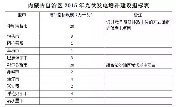 按照國(guó)家能源局《關(guān)于調(diào)增部分地區(qū)2015年光伏電站建設(shè)規(guī)模的通知》(國(guó)能新能[2015]336號(hào))要求,我委原則同意各盟市2015年增補(bǔ)光伏發(fā)電建設(shè)實(shí)施方案的項(xiàng)目安排,現(xiàn)將增補(bǔ)指標(biāo)和在建項(xiàng)目有關(guān)事宜通知如下: