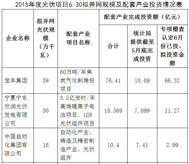關(guān)于2015年度我區(qū)光伏項(xiàng)目6.30擬并網(wǎng)情況公告 根據(jù)2016年6月20日自治區(qū)政府專題會(huì)議精神,按照《自治區(qū)人民政府辦公廳關(guān)于印發(fā)光伏園區(qū)電站項(xiàng)目資源配置指導(dǎo)意見(jiàn)和光伏電站項(xiàng)目備案和建設(shè)管理辦法的通知》和《光伏電站配套產(chǎn)業(yè)項(xiàng)目推進(jìn)合作協(xié)議》,現(xiàn)對(duì)我區(qū)2015年度光伏項(xiàng)目2016年6月30日前并網(wǎng)情況及配套產(chǎn)業(yè)投資情況公告如下: