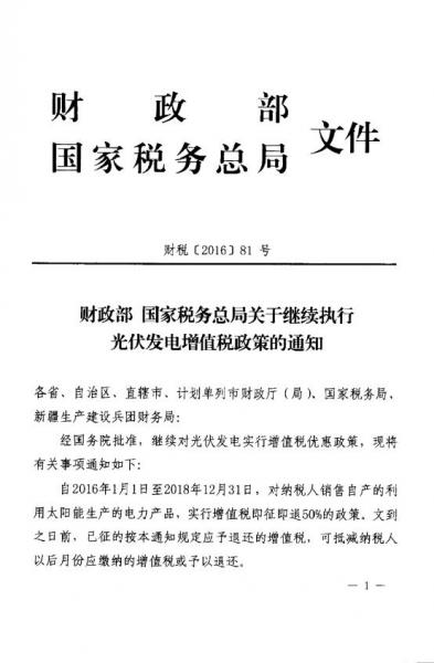 日前,財(cái)政部、國(guó)家稅務(wù)總局發(fā)布關(guān)于繼續(xù)執(zhí)行光伏發(fā)電增值稅政策的通知,通知指出,2016年1月1日至2018年12月31日,對(duì)納稅人銷售自產(chǎn)的利用太陽(yáng)能生產(chǎn)的電力產(chǎn)品,實(shí)行增值稅即征即退50%的政策。
