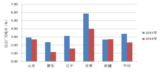 從蒙東、山東、甘肅、遼寧、新疆五個(gè)重點(diǎn)省份(地區(qū))看,2015年平均綜合廠用電率為3.39%,同比增長46.07%。其中甘肅最高,為5.87%,蒙東最低,為2.37%。詳見圖1-3。