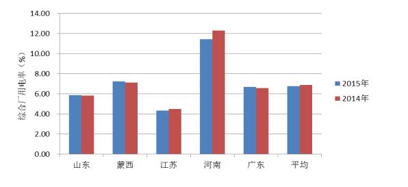從山東、蒙西、江蘇、河南、廣東五個(gè)重點(diǎn)省份(重點(diǎn)省份選取該類型機(jī)組發(fā)電量排序前5名省份,下同。)看,2015年平均綜合廠用電率為6.76%,同比下降1.72%。其中河南最高,為11.41%,江蘇最低,為4.34%。詳見圖1-1。