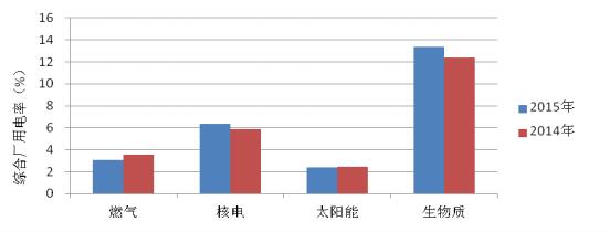 從全國看,2015年核電、生物質(zhì)發(fā)電平均綜合廠用電率分別為6.38%、13.37%,同比分別增長8.14%、7.91%;燃?xì)獍l(fā)電、太陽能發(fā)電平均綜合廠用電率分別為3.06%、2.43%,同比分別下降14.29%、0.82%。詳見圖1-4。