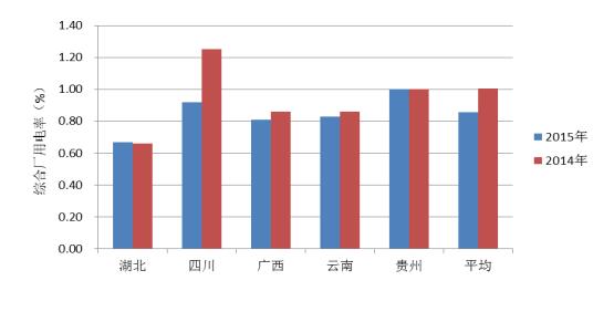 從四川、湖北、云南、貴州、廣西五個(gè)重點(diǎn)省份看,2015年平均綜合廠用電率為0.86%,同比下降14.80%。其中貴州最高,為1%,湖北最低,為0.67%。詳見圖1-2。