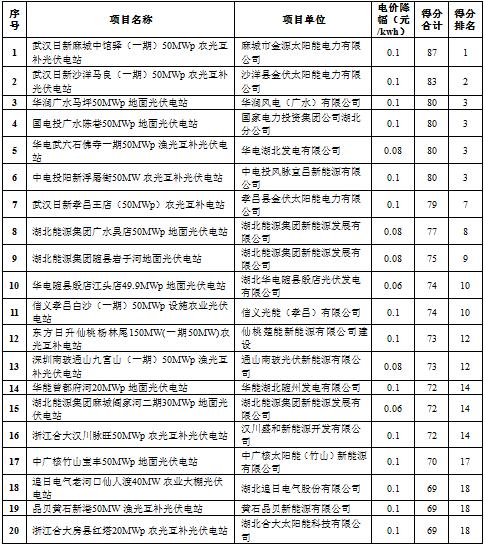 根據(jù)《國家發(fā)展改革委、國家能源局關(guān)于完善光伏發(fā)電規(guī)模管理和實(shí)行競爭方式配置項(xiàng)目的指導(dǎo)意見》(發(fā)改能源〔2016〕1163號)和《湖北省能源局關(guān)于印發(fā)2016年度光伏電站規(guī)模指標(biāo)競爭性分配工作方案的通知》(鄂能源新能〔2016〕101號)要求,湖北省能源局委托湖北省工程咨詢公司組織開展了2016年光伏電站項(xiàng)目競爭比選工作,并于10月11日-17日將比選結(jié)果在省發(fā)展改革委門戶網(wǎng)站上進(jìn)行了公示。公示期間,共有34家企業(yè)提出了比選結(jié)果復(fù)核申請,湖北省工程咨詢公司按相關(guān)規(guī)定和程序組織專家對比選結(jié)果進(jìn)行了認(rèn)真復(fù)核,并將復(fù)核結(jié)果提交省能源局,經(jīng)省能源局局長辦公會審核確認(rèn),現(xiàn)將競爭比選排序前60位的項(xiàng)目予以公布。