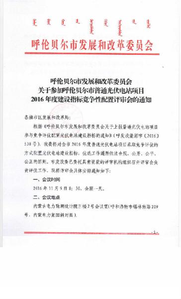 原標(biāo)題:呼倫貝爾市發(fā)展和改革委員會(huì)關(guān)于參加呼倫貝爾市普通光伏電站項(xiàng)目2016年度建設(shè)指標(biāo)競(jìng)爭性配置評(píng)審會(huì)的通知