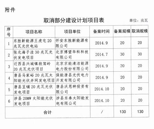 為規(guī)范光伏發(fā)電項目管理,按照《關(guān)于當前全省光伏發(fā)電項目建設情況的通報》(冀發(fā)改能源〔2016〕969號)要求,經(jīng)組織各市對2014年列入建設計劃的備案光伏發(fā)電項目進行清理,現(xiàn)就取消部分項目建設計劃有關(guān)事項通知如下: