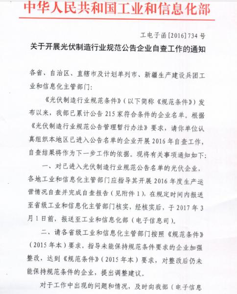 按照工信部電子司《關(guān)于關(guān)于開展光伏制造行業(yè)規(guī)范公告企業(yè)自查工作的通知》(工電子函〔2016〕734號(hào))要求,對(duì)本地區(qū)進(jìn)入光伏制造行業(yè)規(guī)范公告名單的光伏企業(yè)開展自查工作,請(qǐng)符合條件的企業(yè)按照通知要求認(rèn)真落實(shí)。