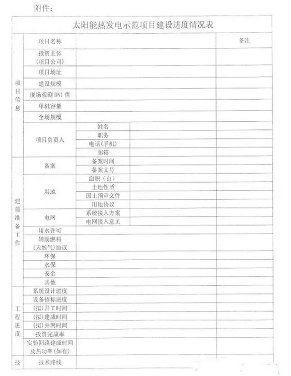 近日,國家能源局發(fā)布《關(guān)于報(bào)送太陽能熱發(fā)電示范項(xiàng)目建設(shè)進(jìn)展情況的通知》(以下簡稱“通知”)。為了解示范項(xiàng)目建設(shè)情況,各省區(qū)能源主管部門須上報(bào)本地項(xiàng)目進(jìn)展情況。