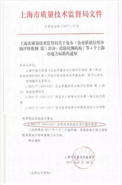 上海地方標(biāo)準(zhǔn)分布式光伏發(fā)電項(xiàng)目服務(wù)規(guī)范 自2017年5月1日起實(shí)施
