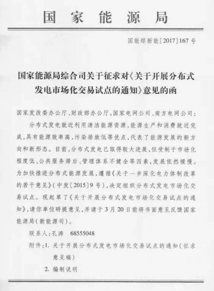 國家能源局?jǐn)M推動分布式發(fā)電市場化交易試點(含征求意見稿全文