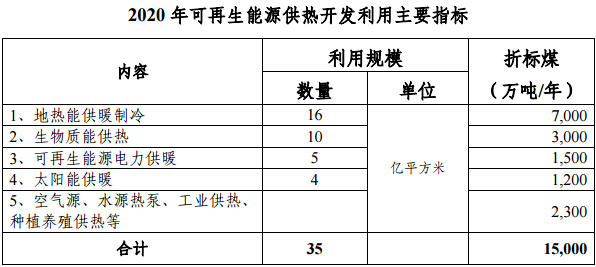 到2020年,全國(guó)可再生能源取暖面積達(dá)到35億平方米左右,比2015年增加約28億平方米,可再生能源供熱總計(jì)約1.5億噸標(biāo)準(zhǔn)煤。在京津冀及周邊地區(qū),可再生能源供暖面積達(dá)到10億平方米,長(zhǎng)三角地區(qū)可再生能源供暖(制冷)面積達(dá)到5億平方米。在城鎮(zhèn)和農(nóng)村地區(qū)實(shí)現(xiàn)較大規(guī)模的可再生能源替代民用散煤取暖。