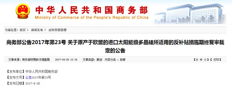2016年4月29日,調(diào)查機關(guān)發(fā)布年度第14號公告,決定自2016年5月1日起對原產(chǎn)于歐盟的進(jìn)口太陽能級多晶硅所適用的反補貼措施進(jìn)行期終復(fù)審調(diào)查。