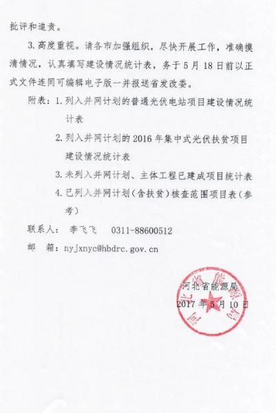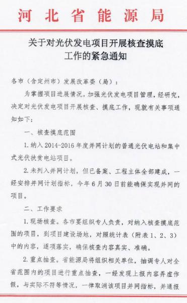 近日,河北省能源局發(fā)文,要求各地市發(fā)改委對納入2014-2016年并網(wǎng)計劃的普通光伏電站和集中式扶貧電站以及未列入并網(wǎng)計劃、但已備案、工程主體全部建成、630前能確保并網(wǎng)的項目進行全面現(xiàn)場核查以及重點抽查。一經(jīng)發(fā)現(xiàn)弄虛作假,與實際情況不符的情況,一律取消該項目并網(wǎng)指標,并通報批評和追責!