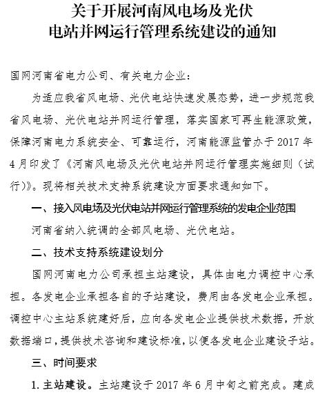 河南風(fēng)電場及光伏電站并網(wǎng)運行管理系統(tǒng)建設(shè)的通知