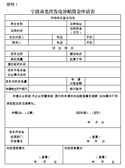 (三)已獲得寧波市光伏發(fā)電補貼資金扶持的項目(第一、二、三批)只需提交《寧波市光伏發(fā)電補貼資金申請表》和電網(wǎng)企業(yè)出具的項目實際發(fā)電量證明(2017年1月1日至2017年6月30日的新增發(fā)電量),申報材料要求同上。