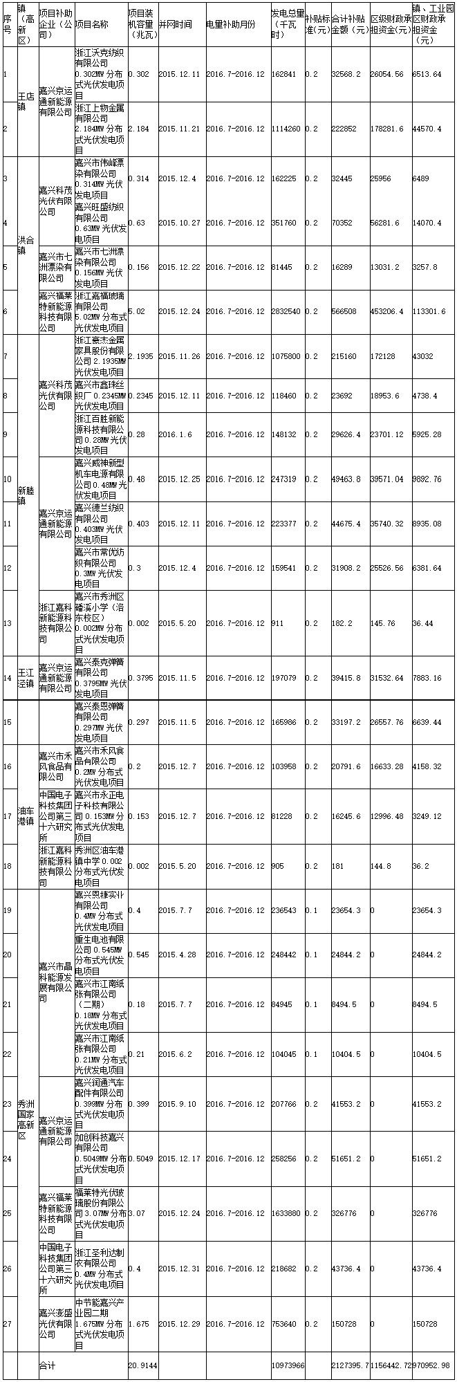 根據(jù)秀洲區(qū)人民政府辦公室《關(guān)于印發(fā)秀洲區(qū)2016年度推進(jìn)光伏發(fā)電應(yīng)用工作實(shí)施意見的通知》(秀洲政辦發(fā)〔2016〕58號)文件精神,2015年度并網(wǎng)發(fā)電分布式光伏發(fā)電項(xiàng)目和2016年并網(wǎng)的戶用光伏發(fā)電項(xiàng)目補(bǔ)助已經(jīng)區(qū)政府常務(wù)會議審議,擬對浙江沃克紡織有限公司0.302MW分布式光伏發(fā)電項(xiàng)目等項(xiàng)目進(jìn)行資金補(bǔ)助,現(xiàn)予以公示。
