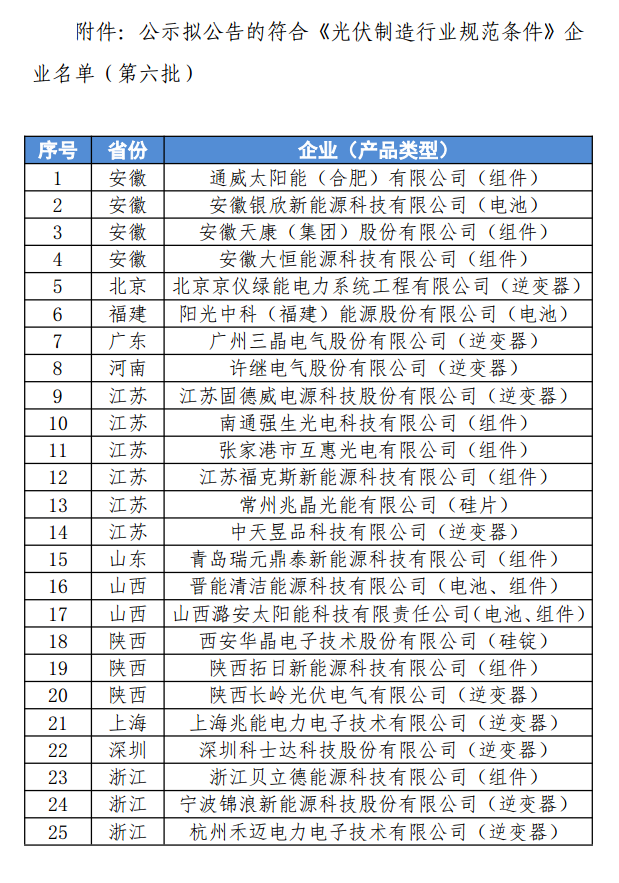 公示擬公告的符合《光伏制造行業(yè)規(guī)范條件》企業(yè)名單(第六批)