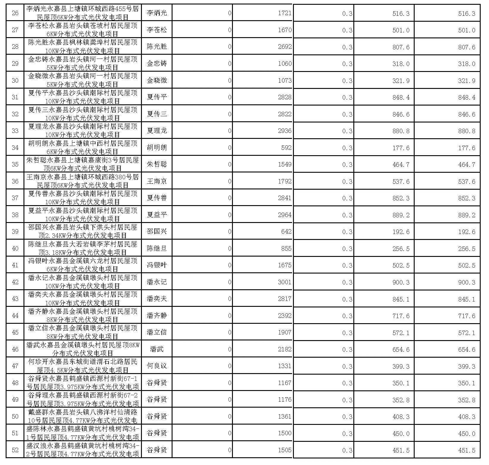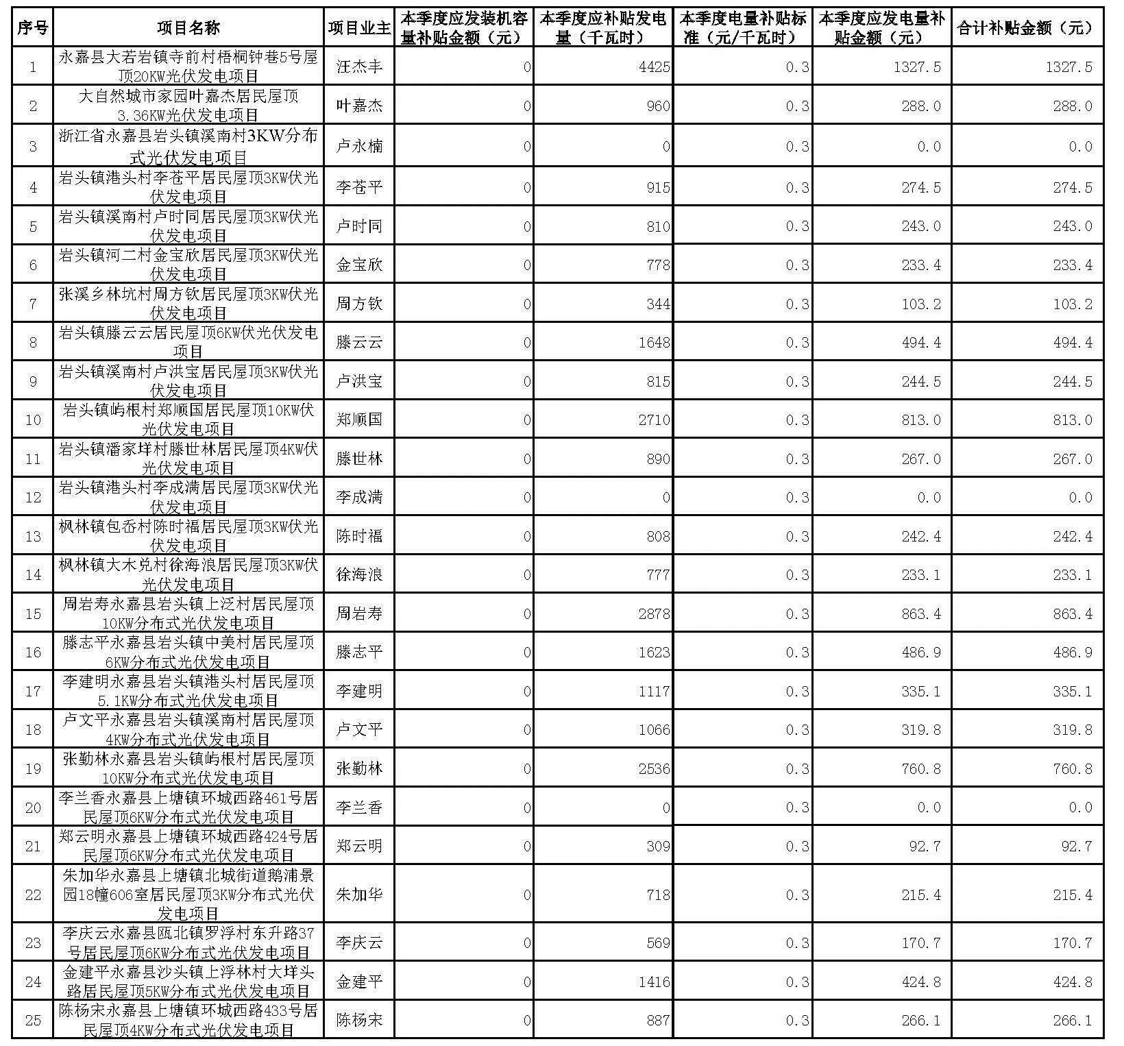 根據(jù)《永嘉縣人民政府關(guān)于扶持分布式光伏發(fā)電的若干意見》(永政發(fā)〔2013〕282號(hào))、《永嘉縣人民政府關(guān)于進(jìn)一步明確永嘉縣分布式光伏發(fā)電項(xiàng)目2016年補(bǔ)貼政策的通知》(永政發(fā)〔2016〕168號(hào))文件精神,現(xiàn)將2017年第二季度永嘉縣分布式光伏發(fā)電擬補(bǔ)貼項(xiàng)目予以公示,接受社會(huì)各界監(jiān)督。公示起止時(shí)間為2017年 7月17日至2017年7月23日,共7天。