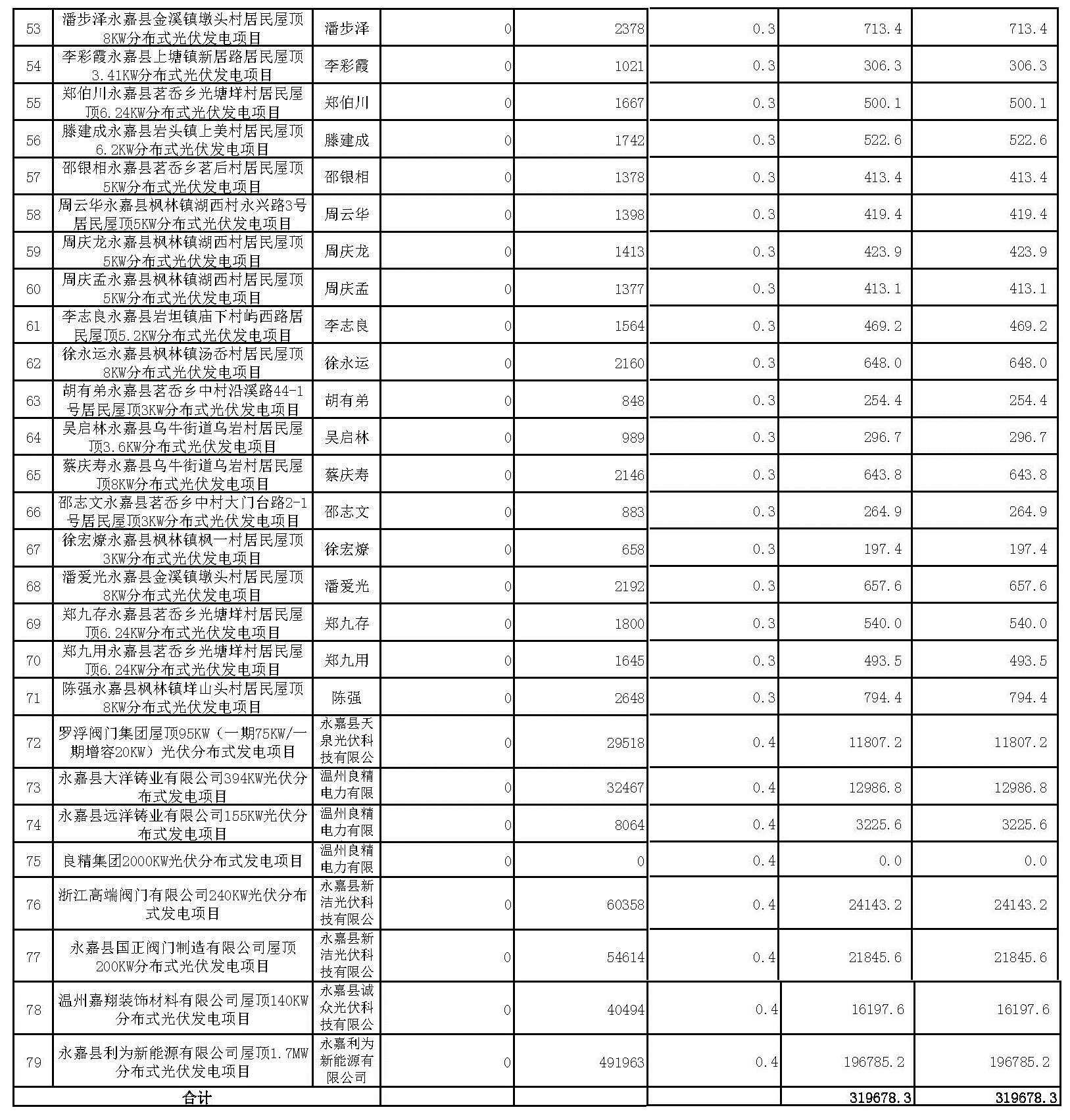 根據(jù)《永嘉縣人民政府關(guān)于扶持分布式光伏發(fā)電的若干意見》(永政發(fā)〔2013〕282號(hào))、《永嘉縣人民政府關(guān)于進(jìn)一步明確永嘉縣分布式光伏發(fā)電項(xiàng)目2016年補(bǔ)貼政策的通知》(永政發(fā)〔2016〕168號(hào))文件精神,現(xiàn)將2017年第二季度永嘉縣分布式光伏發(fā)電擬補(bǔ)貼項(xiàng)目予以公示,接受社會(huì)各界監(jiān)督。公示起止時(shí)間為2017年 7