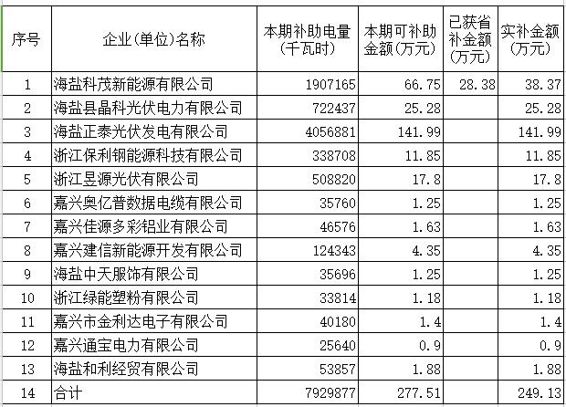 為促進(jìn)我縣光伏產(chǎn)業(yè)健康發(fā)展,根據(jù)縣人民政府辦公室《關(guān)于印發(fā)〈海鹽縣推進(jìn)工業(yè)強(qiáng)縣建設(shè)加快轉(zhuǎn)型發(fā)展財(cái)政扶持若干政策〉的通知》(鹽政辦發(fā)〔2015〕65號(hào))精神和縣財(cái)政局印發(fā)《海鹽縣工業(yè)發(fā)展財(cái)政專項(xiàng)資金管理辦法(試行)》(鹽財(cái)企〔2016〕30號(hào))規(guī)定,經(jīng)審核本次共有13家企業(yè)符合補(bǔ)助條件,經(jīng)報(bào)縣政府同意,現(xiàn)撥付第四批光伏發(fā)電項(xiàng)目投資方財(cái)政補(bǔ)助資金249.13萬元,資金列專用基金“工業(yè)發(fā)展資金”支出。