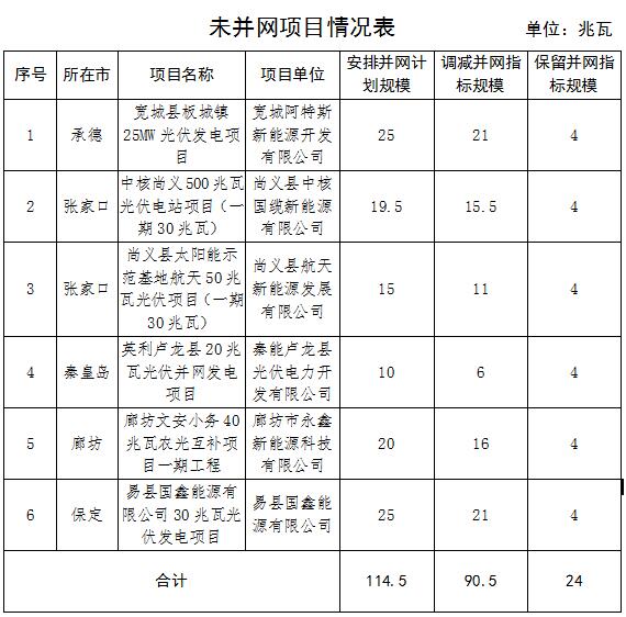 按照河北省能源局《關(guān)于對光伏發(fā)電項目開展核查摸底工作的緊急通知》和《關(guān)于組織企業(yè)出具并網(wǎng)承諾函的緊急通知》要求,已列入并網(wǎng)計劃的光伏項目應(yīng)于6月30日前建成并網(wǎng),未并網(wǎng)項目(并網(wǎng)指標)將進行調(diào)減。經(jīng)省級電網(wǎng)公司確認、網(wǎng)上公示和核實,現(xiàn)對未按要求并網(wǎng)的普通光伏發(fā)電項目(并網(wǎng)指標)予以調(diào)減,并將有關(guān)事項通知如下: