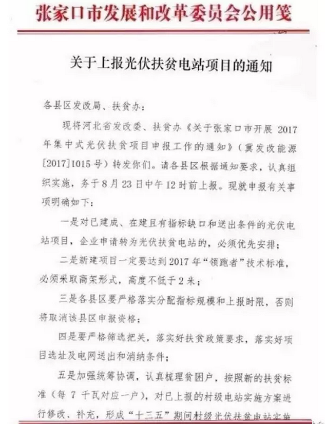 河北張家口市發(fā)改委關于上報光伏扶貧電站項目的通知