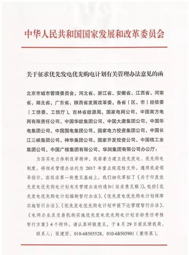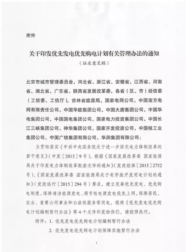 2017年8月21日,國家發(fā)改委就《關(guān)于印發(fā)優(yōu)先發(fā)電優(yōu)先購電計(jì)劃有關(guān)管理辦法的通知》(下稱《管理辦法》”)征求意見,包括《優(yōu)先發(fā)電優(yōu)先購電計(jì)劃編制暫行辦法》、《優(yōu)先發(fā)電優(yōu)先購電計(jì)劃保障實(shí)施暫行辦法》、《優(yōu)先發(fā)電優(yōu)先購電計(jì)劃申報(bào)下達(dá)管理暫行辦法》、《電網(wǎng)企業(yè)及交易機(jī)構(gòu)實(shí)施優(yōu)先發(fā)電優(yōu)先購電計(jì)劃目標(biāo)責(zé)任考核暫行方案》等4個(gè)附件。