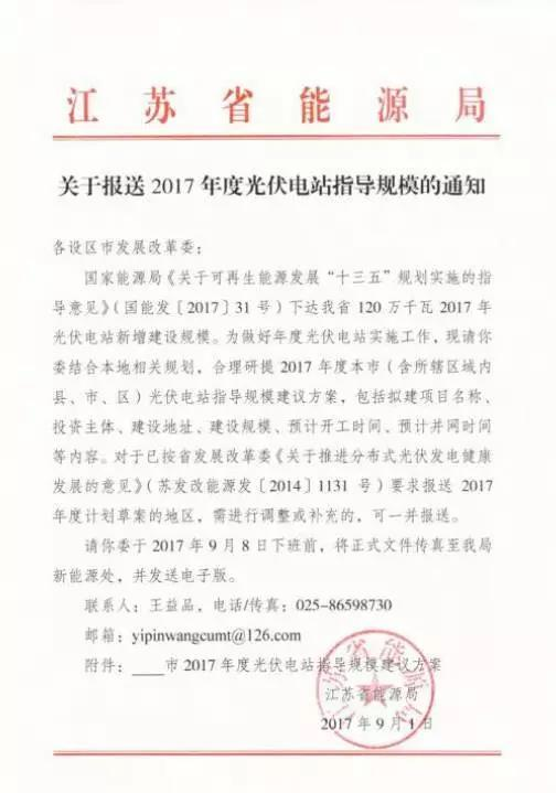 1200MW!江蘇能源局要求9月8日前上報(bào)各地2017光伏指標(biāo)方案