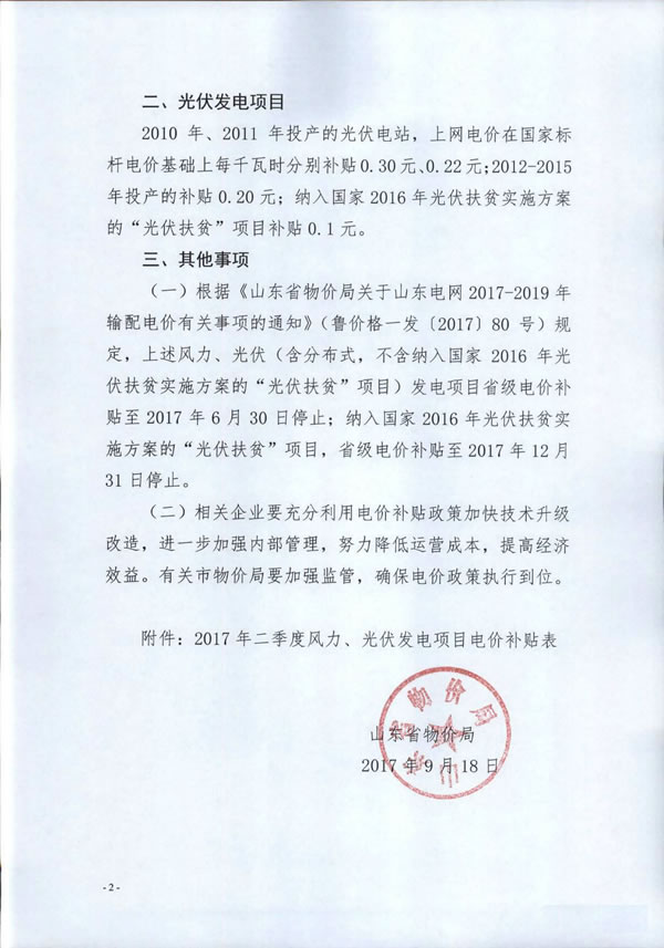 山東物價(jià)局關(guān)于2017年2季度風(fēng)力光伏發(fā)電項(xiàng)目電價(jià)補(bǔ)貼的通知,原文件如下: