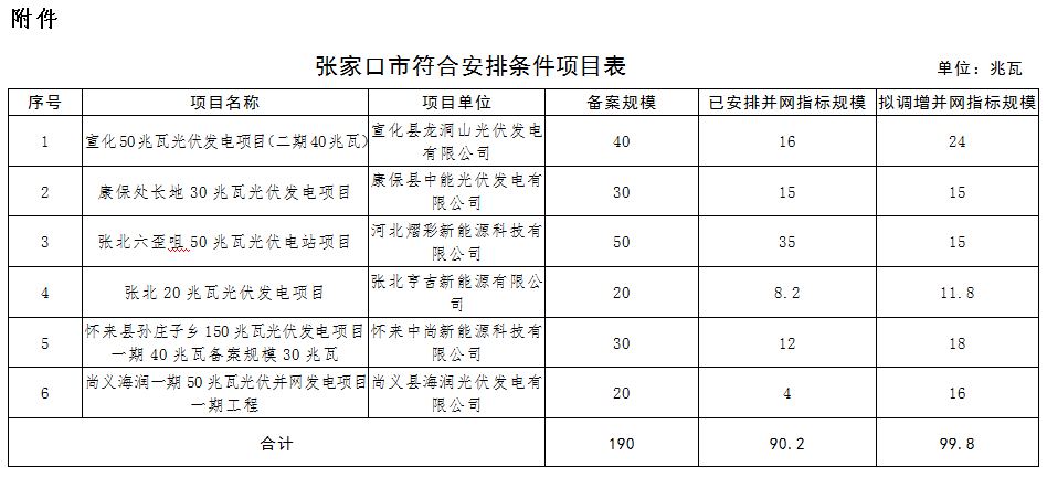 6月30日前,已全額并網(wǎng)或具備并網(wǎng)條件,但因冀北暫停并網(wǎng)原因未并網(wǎng)、仍有指標(biāo)缺口的項(xiàng)目,予以補(bǔ)齊缺口。已申請轉(zhuǎn)光伏扶貧項(xiàng)目不再安排。涉及項(xiàng)目6個(gè)、99.8兆瓦(見附表)。
