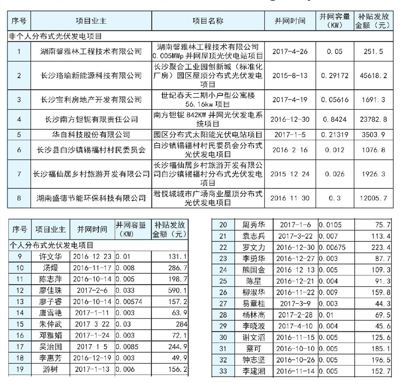 根據(jù)《長沙市人民政府辦公廳關(guān)于加快分布式光伏發(fā)電應(yīng)用的實(shí)施意見》(長政辦發(fā)〔2017〕8號(hào))和長沙市能源局、長沙市財(cái)政局《長沙市分布式光伏發(fā)電補(bǔ)貼方案》(長能源〔2016〕41號(hào))相關(guān)要求,現(xiàn)將2017上半年度長沙市分布式光伏發(fā)電擬補(bǔ)貼項(xiàng)目公示如下。如有異議,請(qǐng)?jiān)诠局掌?個(gè)工作日內(nèi)向長沙市能源局、長沙市財(cái)政局書面實(shí)名提出。