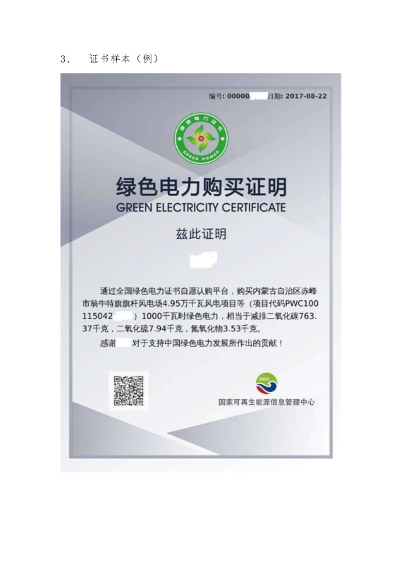 綠色電力證書是國家對發(fā)電企業(yè)每兆瓦時非水可再生能源上網(wǎng)電量頒發(fā)的具有獨特標識代碼的電子證書,陸上風電、光伏發(fā)電企業(yè)(不含分布式光伏發(fā)電,下同)所產(chǎn)生的可再生能源發(fā)電量可獲發(fā)綠證。風電、光伏發(fā)電企業(yè)出售綠證后,相應的電量不再享受國家可再生能源電價附加資金的補貼。綠色電力證書的認購方,實際上是獲得了聲明權,即宣稱自身使用了綠色能源。每購買一個證書相當于使用1000千瓦時的綠色電力,替代約300千克標準煤,相當于減排二氧化碳763.37千克,二氧化硫7.94千克,氮氧化物3.53千克。
