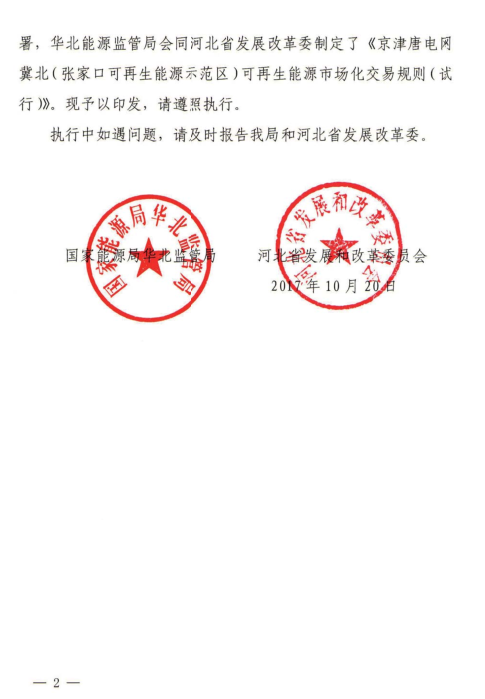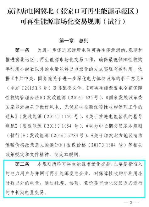 華北能源監(jiān)管局、河北省發(fā)改委日前聯(lián)合印發(fā)了《京津唐電網(wǎng)冀北(張家口可再生能源示范區(qū))可再生能源市場化交易規(guī)則(試行)》特急文件。規(guī)則中所稱可再生能源市場化交易,主要是指準入的電力用戶與并網(wǎng)可再生能源發(fā)電企業(yè),對保障性收購年利用小時數(shù)以外的電量,通過掛牌、協(xié)商、競價等市場化交易方式進行的中長期電量交